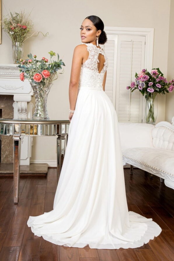 Chiffon is always right with beautifully embroidered wedding gown! The drapey fabric is also great with high neckline, which elongates your body frame. This dress even features side slit to show off your legs and sheer cut-out open back that give you a stylish look. That'll surely keep all eyes on you!