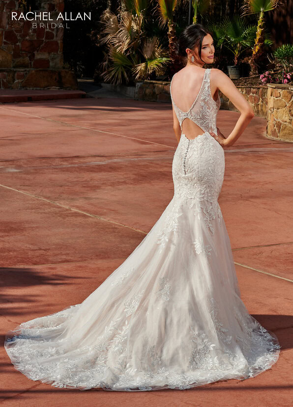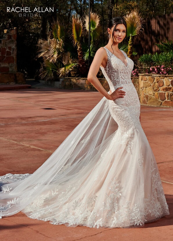 The mermaid-style wedding dress has a strapless sweetheart neckline, a detachable bodice liner, a tulle overlay with lace applique and beads, a chapel train, and a sheer long-sleeve jacket adorned with beads and 3D flowers.