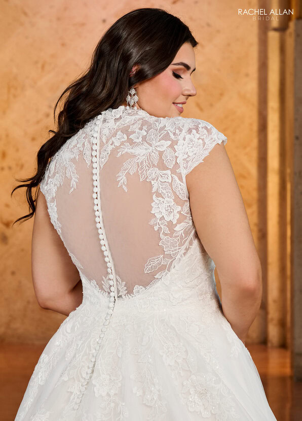 Rachel Allan brings the glamour with this tulle and glitter tulle ballgown. Perfect for any bride looking to make a statement, this dress is sweet yet edgy and modern. The applique mini sleeves add beautiful detail to the design as well as enhancing the romantic look of this gown. The back fastens with a row of button closure and also features elegant appliqués that catch the eye. From front to back, this dreamy dress captures a timelessly romantic beauty as the chapel train walks down the aisle.