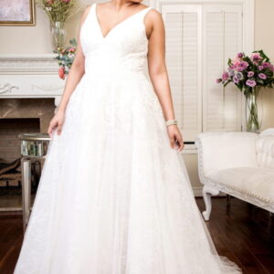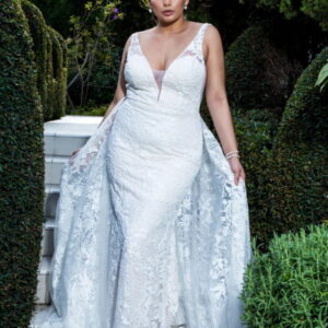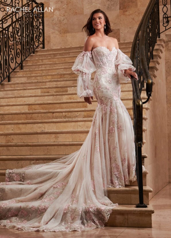 Tulle over lace fit and flare bridal gown with strapless sweetheart neck line, floral lace applique detail, beading embellishment, sheer corset bodice with detachable liner, detachable puff sleeves, and semi-cathedral train.