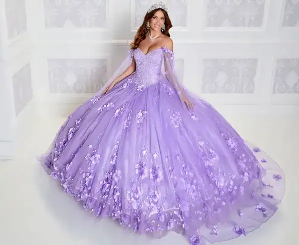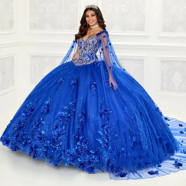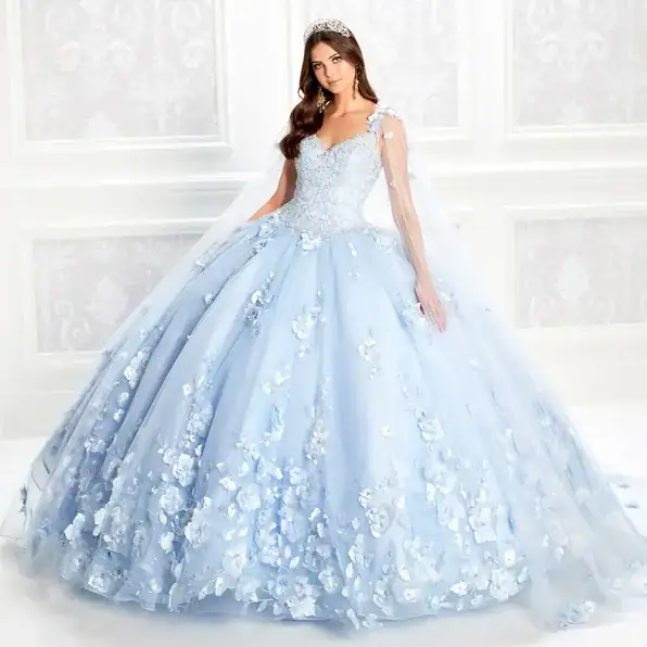Dazzling sleeveless V-neck quinceanera dress with detachable long cape. This Princesa gown is designed with an elegant basque bodice and beading details that accompany the three-dimensional flowers along the skirt, it also includes lights. This gown is available with no lights as style PR22021NL
